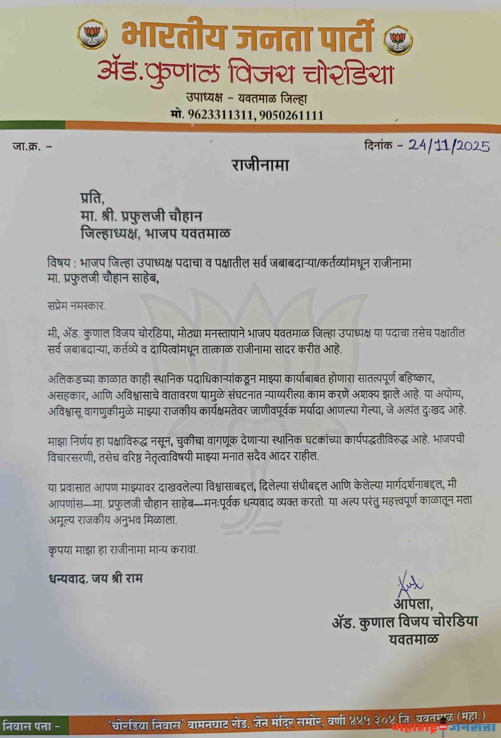 भाजप जिल्हा उपाध्यक्ष कुणाल चोरडिया यांचा पक्षाचा व सर्व पदांचा राजीनामा; “स्थानिक नेत्यांनी बहिष्कार घातला”